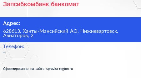 Запсибкомбанк, банкомат по адресу 628613, Ханты-Мансийский АО, Нижневартовск, Авиаторов, 2 в дальнейшем Организация, размещена в следующих категориях: