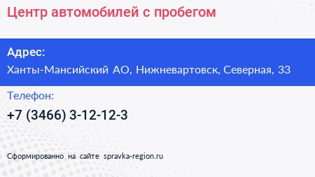 Центр автомобилей с пробегом по адресу Ханты-Мансийский АО, Нижневартовск, Северная, 33 в дальнейшем Организация, размещена в следующих категориях: