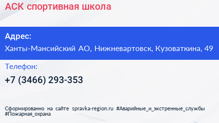 АСК, спортивная школа по адресу Ханты-Мансийский АО, Нижневартовск, Кузоваткина, 49 в дальнейшем Организация, размещена в следующих категориях:
