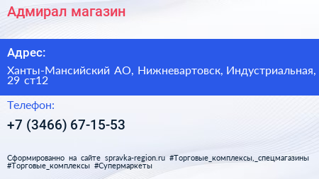 Адмирал, магазин по адресу Ханты-Мансийский АО, Нижневартовск, Индустриальная, 29 ст12 в дальнейшем Организация, размещена в следующих категориях: