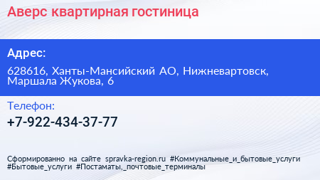 Аверс, квартирная гостиница по адресу 628616, Ханты-Мансийский АО, Нижневартовск, Маршала Жукова, 6 в дальнейшем Организация, размещена в следующих категориях: