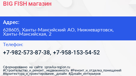 BIG FISH, магазин по адресу 628605, Ханты-Мансийский АО, Нижневартовск, Ханты-Мансийская, 2 в дальнейшем Организация, размещена в следующих категориях: