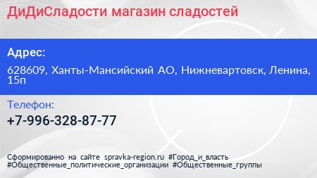 ДиДиСладости, магазин сладостей по адресу 628609, Ханты-Мансийский АО, Нижневартовск, Ленина, 15п в дальнейшем Организация, размещена в следующих категориях: