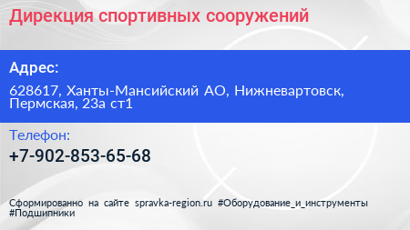 Дирекция спортивных сооружений по адресу 628617, Ханты-Мансийский АО, Нижневартовск, Пермская, 23а ст1 в дальнейшем Организация, размещена в следующих категориях: