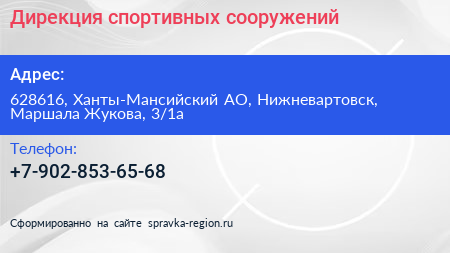 Дирекция спортивных сооружений по адресу 628616, Ханты-Мансийский АО, Нижневартовск, Маршала Жукова, 3/1а в дальнейшем Организация, размещена в следующих категориях: