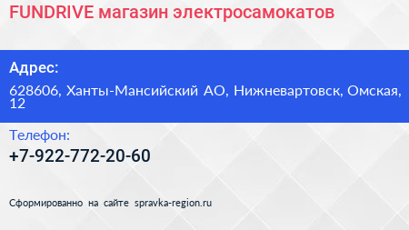 FUNDRIVE, магазин электросамокатов по адресу 628606, Ханты-Мансийский АО, Нижневартовск, Омская, 12 в дальнейшем Организация, размещена в следующих категориях: