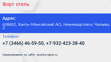 Форт, отель по адресу 628602, Ханты-Мансийский АО, Нижневартовск, Чапаева, 3 в дальнейшем Организация, размещена в следующих категориях: