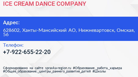 ICE-CREAM DANCE COMPANY по адресу 628602, Ханты-Мансийский АО, Нижневартовск, Омская, 56 в дальнейшем Организация, размещена в следующих категориях: