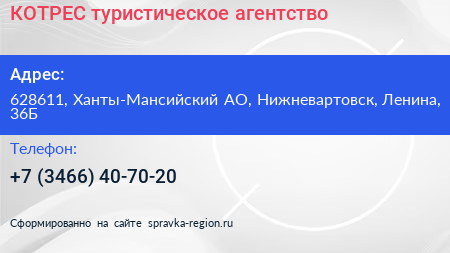 КОТРЕС, туристическое агентство по адресу 628611, Ханты-Мансийский АО, Нижневартовск, Ленина, 36Б в дальнейшем Организация, размещена в следующих категориях: