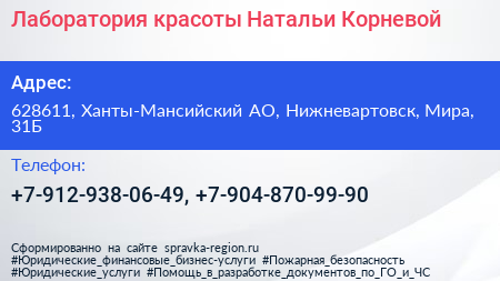 Лаборатория красоты Натальи Корневой по адресу 628611, Ханты-Мансийский АО, Нижневартовск, Мира, 31Б в дальнейшем Организация, размещена в следующих категориях: