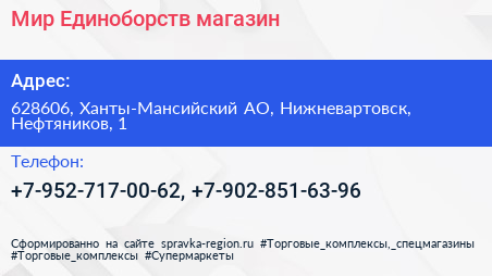 Мир Единоборств, магазин по адресу 628606, Ханты-Мансийский АО, Нижневартовск, Нефтяников, 1 в дальнейшем Организация, размещена в следующих категориях: