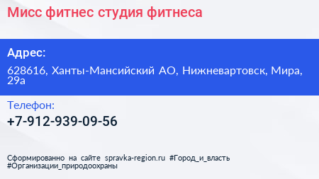 Мисс-фитнес, студия фитнеса по адресу 628616, Ханты-Мансийский АО, Нижневартовск, Мира, 29а в дальнейшем Организация, размещена в следующих категориях: