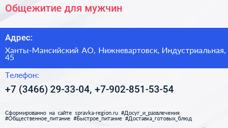 Общежитие для мужчин по адресу Ханты-Мансийский АО, Нижневартовск, Индустриальная, 45 в дальнейшем Организация, размещена в следующих категориях: