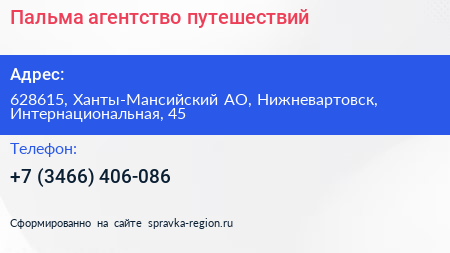 Пальма, агентство путешествий по адресу 628615, Ханты-Мансийский АО, Нижневартовск, Интернациональная, 45 в дальнейшем Организация, размещена в следующих категориях: