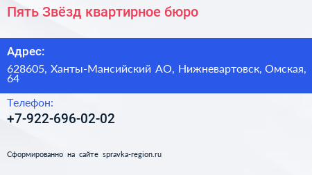 Пять Звёзд, квартирное бюро по адресу 628605, Ханты-Мансийский АО, Нижневартовск, Омская, 64 в дальнейшем Организация, размещена в следующих категориях: