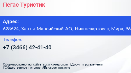 Пегас Туристик по адресу 628624, Ханты-Мансийский АО, Нижневартовск, Мира, 96 в дальнейшем Организация, размещена в следующих категориях: