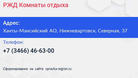 РЖД, Комнаты отдыха по адресу Ханты-Мансийский АО, Нижневартовск, Северная, 37 в дальнейшем Организация, размещена в следующих категориях: