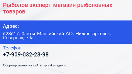 Рыболов-эксперт, магазин рыболовных товаров по адресу 628617, Ханты-Мансийский АО, Нижневартовск, Северная, 74а в дальнейшем Организация, размещена в следующих категориях: