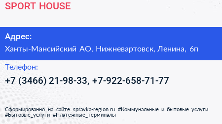 SPORT HOUSE по адресу Ханты-Мансийский АО, Нижневартовск, Ленина, 6п в дальнейшем Организация, размещена в следующих категориях: