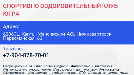 СПОРТИВНО-ОЗДОРОВИТЕЛЬНЫЙ КЛУБ ЮГРА по адресу 628601, Ханты-Мансийский АО, Нижневартовск, Первомайская, 63 в дальнейшем Организация, размещена в следующих категориях: