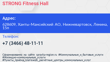 STRONG Fitness Hall по адресу 628609, Ханты-Мансийский АО, Нижневартовск, Ленина, 15п в дальнейшем Организация, размещена в следующих категориях: