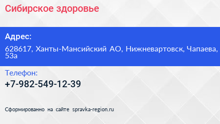 Сибирское здоровье по адресу 628617, Ханты-Мансийский АО, Нижневартовск, Чапаева, 53а в дальнейшем Организация, размещена в следующих категориях: