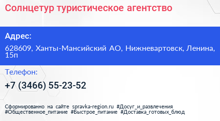 Солнцетур, туристическое агентство по адресу 628609, Ханты-Мансийский АО, Нижневартовск, Ленина, 15п в дальнейшем Организация, размещена в следующих категориях: