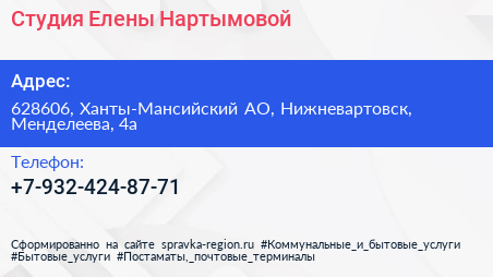 Студия Елены Нартымовой по адресу 628606, Ханты-Мансийский АО, Нижневартовск, Менделеева, 4а в дальнейшем Организация, размещена в следующих категориях: