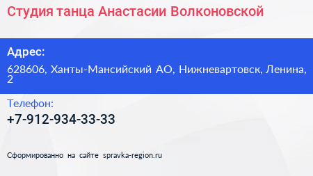 Студия танца Анастасии Волконовской по адресу 628606, Ханты-Мансийский АО, Нижневартовск, Ленина, 2 в дальнейшем Организация, размещена в следующих категориях: