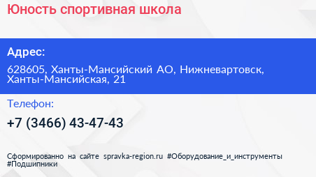 Юность, спортивная школа по адресу 628605, Ханты-Мансийский АО, Нижневартовск, Ханты-Мансийская, 21 в дальнейшем Организация, размещена в следующих категориях: