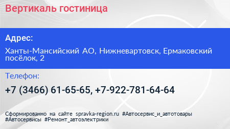 Для связи с организацией воспользуйтесь номером телефона: +7 (3466) 61-65-65, +7-922-781-64-64. Ежедневно с 00:00 до 24:00, вы можете обратиться в эту организацию.