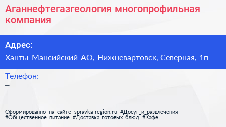 Аганнефтегазгеология, многопрофильная компания по адресу Ханты-Мансийский АО, Нижневартовск, Северная, 1п в дальнейшем Организация, размещена в следующих категориях: