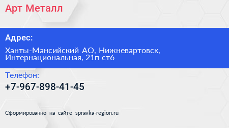 Арт.Металл по адресу Ханты-Мансийский АО, Нижневартовск, Интернациональная, 21п ст6 в дальнейшем Организация, размещена в следующих категориях: