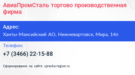 АвиаПромСталь, торгово-производственная фирма по адресу Ханты-Мансийский АО, Нижневартовск, Мира, 14п в дальнейшем Организация, размещена в следующих категориях: