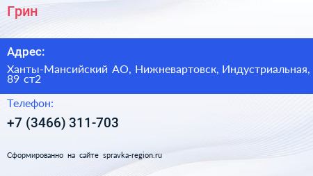 Грин по адресу Ханты-Мансийский АО, Нижневартовск, Индустриальная, 89 ст2 в дальнейшем Организация, размещена в следующих категориях: