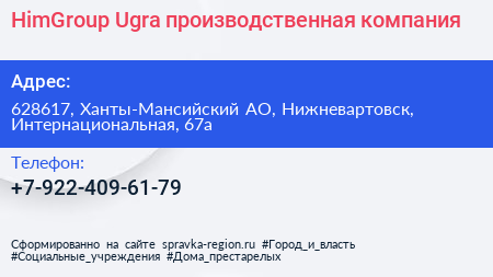 HimGroup-Ugra, производственная компания по адресу 628617, Ханты-Мансийский АО, Нижневартовск, Интернациональная, 67а в дальнейшем Организация, размещена в следующих категориях: