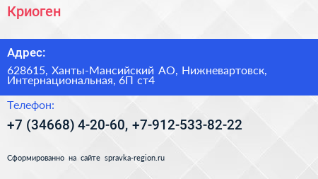 Криоген по адресу 628615, Ханты-Мансийский АО, Нижневартовск, Интернациональная, 6П ст4 в дальнейшем Организация, размещена в следующих категориях: