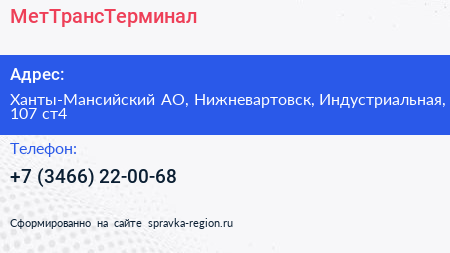 МетТрансТерминал по адресу Ханты-Мансийский АО, Нижневартовск, Индустриальная, 107 ст4 в дальнейшем Организация, размещена в следующих категориях: