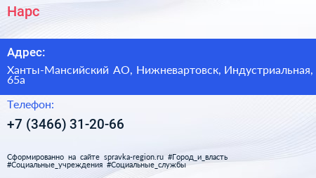 Нарс по адресу Ханты-Мансийский АО, Нижневартовск, Индустриальная, 65а в дальнейшем Организация, размещена в следующих категориях: