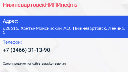 НижневартовскНИПИнефть по адресу 628616, Ханты-Мансийский АО, Нижневартовск, Ленина, 5 в дальнейшем Организация, размещена в следующих категориях: