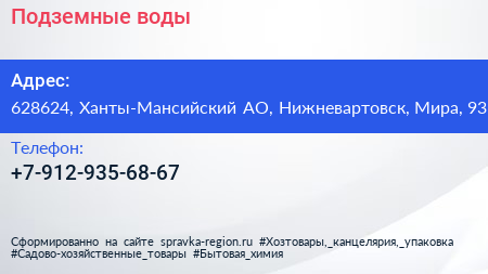 Подземные воды по адресу 628624, Ханты-Мансийский АО, Нижневартовск, Мира, 93 в дальнейшем Организация, размещена в следующих категориях: