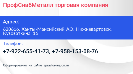 ПрофСнабМеталл, торговая компания по адресу 628616, Ханты-Мансийский АО, Нижневартовск, Кузоваткина, 16 в дальнейшем Организация, размещена в следующих категориях: