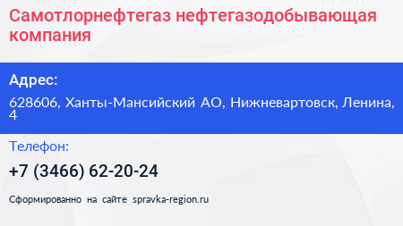 Самотлорнефтегаз, нефтегазодобывающая компания по адресу 628606, Ханты-Мансийский АО, Нижневартовск, Ленина, 4 в дальнейшем Организация, размещена в следующих категориях: