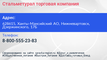 Стальметурал, торговая компания по адресу 628615, Ханты-Мансийский АО, Нижневартовск, Дзержинского, 17Б в дальнейшем Организация, размещена в следующих категориях: