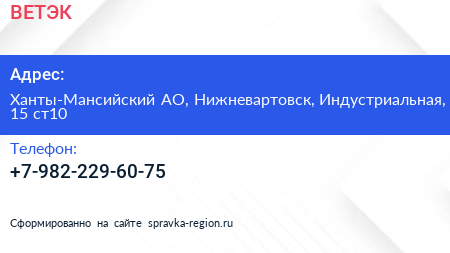 ВЕТЭК по адресу Ханты-Мансийский АО, Нижневартовск, Индустриальная, 15 ст10 в дальнейшем Организация, размещена в следующих категориях: