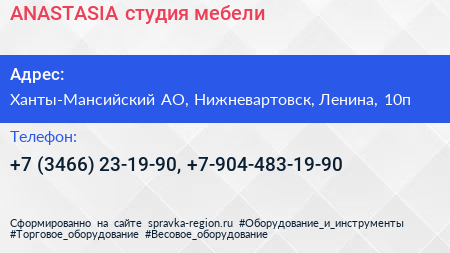 ANASTASIA, студия мебели по адресу Ханты-Мансийский АО, Нижневартовск, Ленина, 10п в дальнейшем Организация, размещена в следующих категориях:
