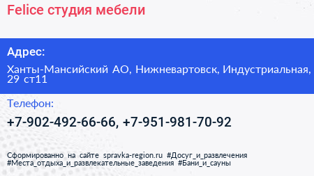 Felice, студия мебели по адресу Ханты-Мансийский АО, Нижневартовск, Индустриальная, 29 ст11 в дальнейшем Организация, размещена в следующих категориях: