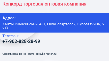 Конкорд, торговая оптовая компания по адресу Ханты-Мансийский АО, Нижневартовск, Кузоваткина, 5 ст3 в дальнейшем Организация, размещена в следующих категориях: