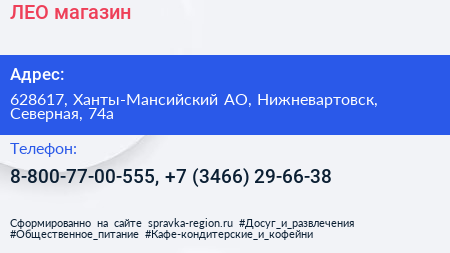 ЛЕО, магазин по адресу 628617, Ханты-Мансийский АО, Нижневартовск, Северная, 74а в дальнейшем Организация, размещена в следующих категориях: