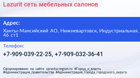 Lazurit, сеть мебельных салонов по адресу Ханты-Мансийский АО, Нижневартовск, Индустриальная, 46 ст1 в дальнейшем Организация, размещена в следующих категориях: